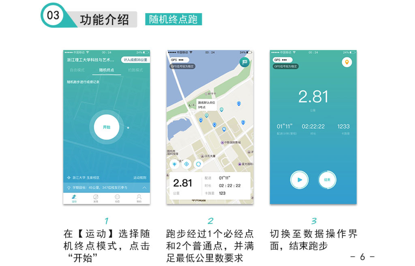 (1)“随机终点”和“约定终点”两种跑步模式可随意选择,只要完成跑步任务,都计入成绩;