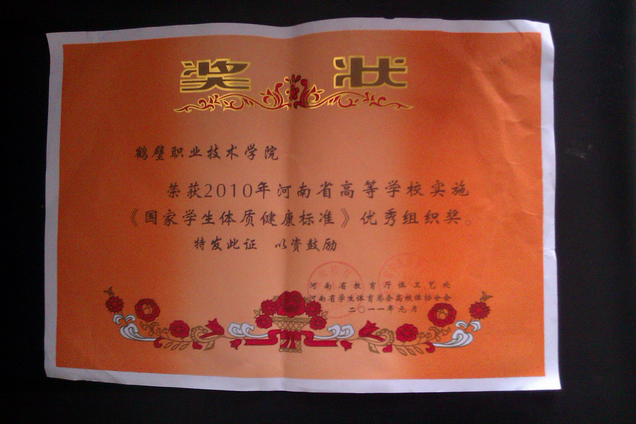 在2010年河南省高等学校实施《国家学生体质健康标准》的工作中,河南省教育厅体卫艺处、河南省学生体育总会高校体协分会授予beat365中文登录入口优秀组织奖。