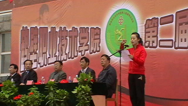 学院体育场看台两侧悬挂的“发扬奥运精神,创造校运佳绩;”和“挑战运动极限,演绎健美人生”巨幅标语格外引人注目。