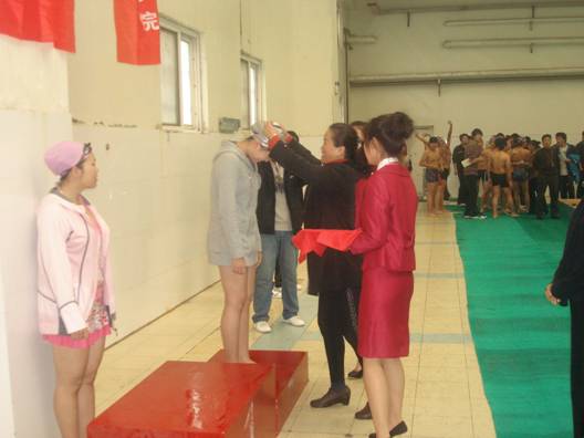 为获得第一项女子50米蛙泳比赛冠军队员颁奖