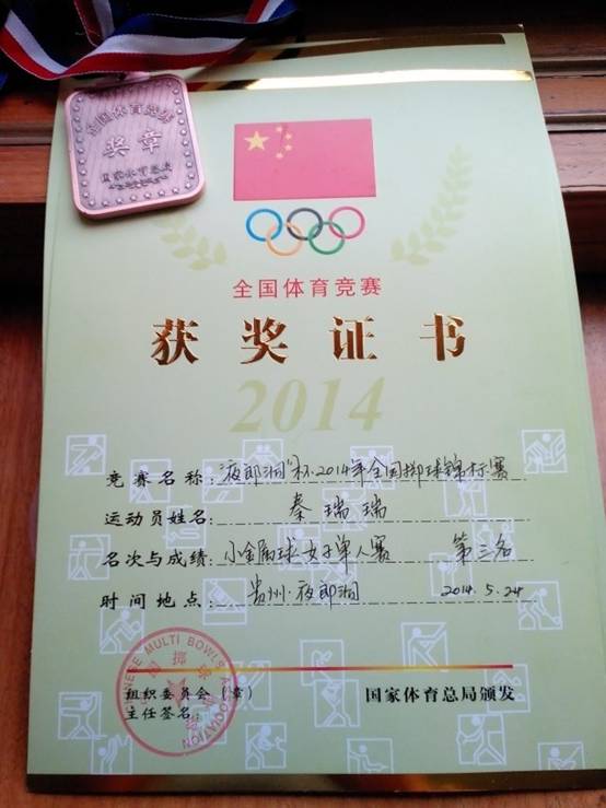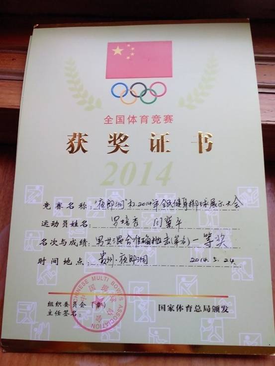 国家体育总局小球运动管理中心、中国掷球协会、贵州省体育局主办的“2014年全国地掷球锦标赛与全民健身掷球展示大会”,于2014年5月16日至5月25日在贵州夜郎洞风景区举行。 参加的队伍有浙江工贸、职业技术学院、西安体院、北京体育大学、衢州职业,西安体院高职、河南科技学院中国石化、阳谷体育等21个队伍。我院派罗培秀、袁慧敏、秦瑞瑞三名女队员参加小金属项目比赛,取得了展示男女混双准确抛击第一名,锦标赛女子单打第三名,女子双打第四名,女子团体第五名,女子准确抛击第六名。