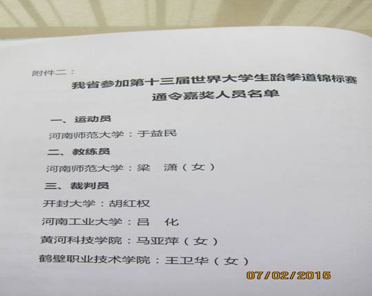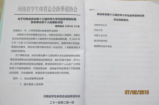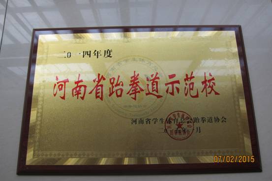 会上颁发了2014年度“河南省跆拳道示范校”、“河南省学生体育总会跆拳道协会裁判员培训基地”、“河南省学生体育总会跆拳道协会教练员培训基地”等牌匾。我院被教育厅授予“河南省跆拳道示范校”。在对全省参加第十三届世界大学生跆拳道锦标赛上获得突出贡献奖的单位和个人的表彰中,我院在第十三届世界大学生跆拳道锦标赛上获得突出贡献奖,王卫华被通令嘉奖。