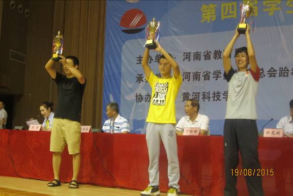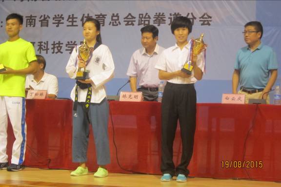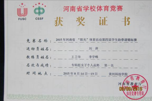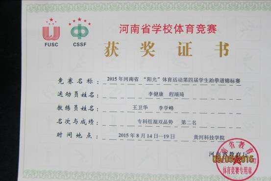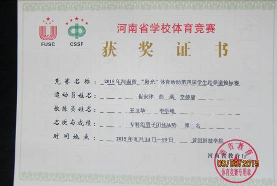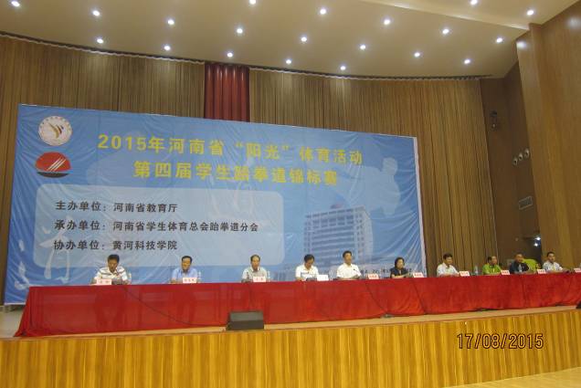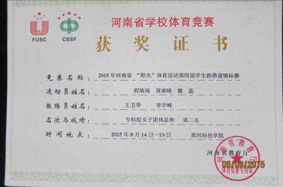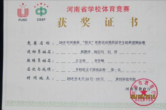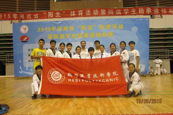 2015年河南省“阳光”体育活动第四届跆拳道锦标赛于2015年8月18日下午在黄河科技学院新体育馆胜利闭幕!本届跆拳道锦标赛历时4天,共有40多所中小学和本、专科院校参加,参赛队员850多人名,汇聚了河南省跆拳道精英。在为期4天的比赛期间,我院教练员和运动员认真、全面分析对手,科学合理地运用战术,团结一致,顽强拼搏,取得了大学生专科组品势团体第二名、竞技团体第一名的优异成绩。
