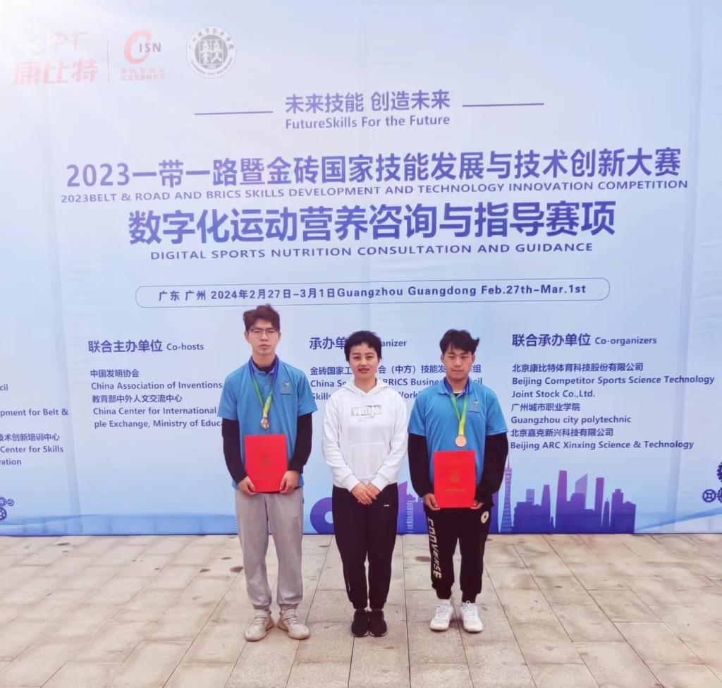 2024年2月27日至3月1日,2023一带一路金砖国家技能发展与技术创新大赛数字化运动营养咨询与指导赛项在广东省广州市举办。本次比赛共吸引来自全国23个省、自治区、直辖市的196支队伍参赛,其中高等职业教育111支,职工58支,中等职业教育27支。beat365中文登录入口张利娜老师指导葛清官、刘金豪两名同学参加了本次比赛,两名学生同时获得高职组三等奖。