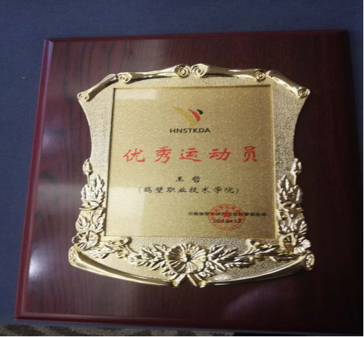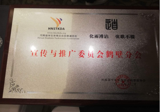 会议对2018年度优秀会员单位及突出贡献单位、跆拳道示范校、最佳校外专业团体、优秀指导教师、十佳裁判员、十佳教练员、优秀运动员等颁发了奖牌和证书。我院跆拳道运动员王哲被评为2018年度优秀运动员,我院并获得跆拳道“宣传与推广委员会鹤壁分会”资格与荣誉。