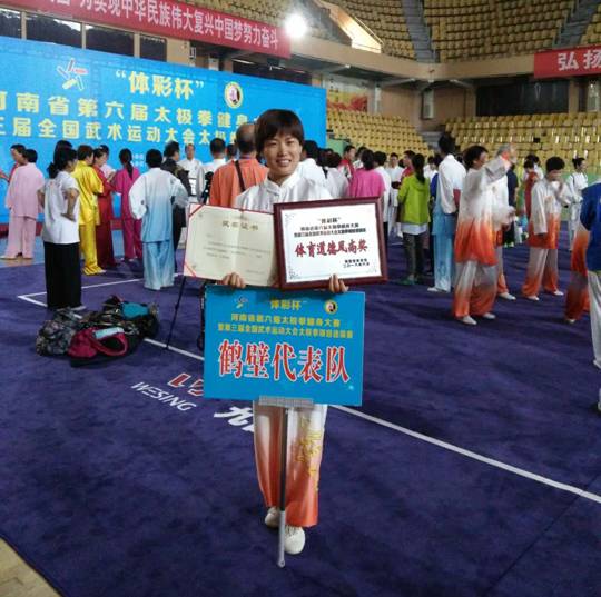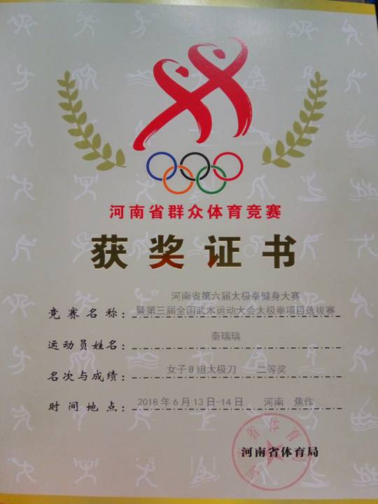 2018年6月13日,由河南省体育局主办,河南省武术运动管理中心、焦作市体育局承办的“体彩杯”河南省第六届太极拳健身大赛暨第三届全国武术运动大会太极拳项目选拔赛在焦作市体育馆举行,来自全省各地25支代表队的337名太极拳爱好者参加了此项比赛。beat365秦瑞瑞老师代表鹤壁市代表队参加本次比赛,并在比赛中取得个人太极刀二等奖,集体太极拳二等奖及体育道德风尚奖称号。