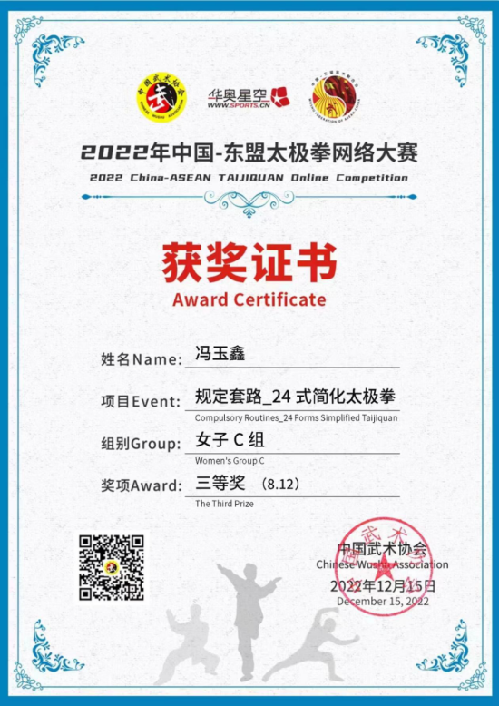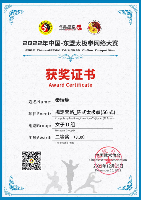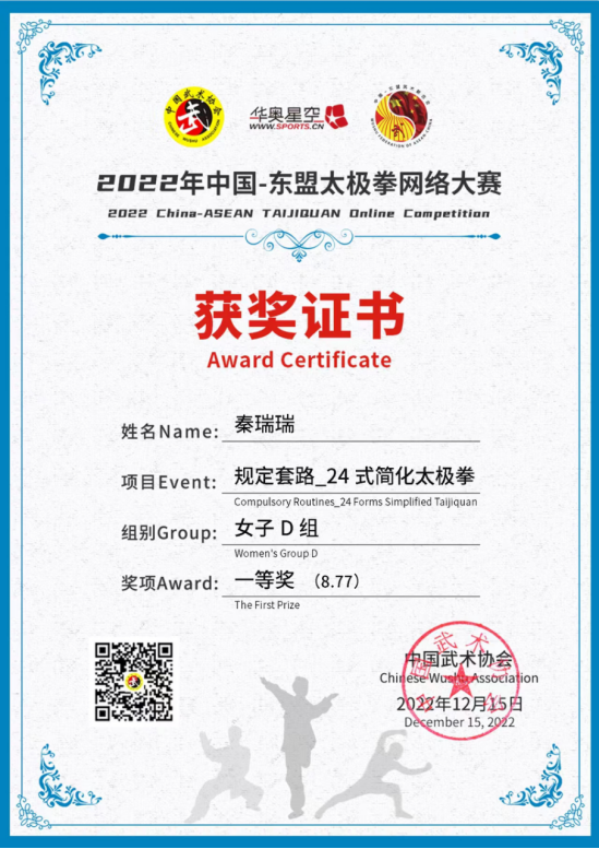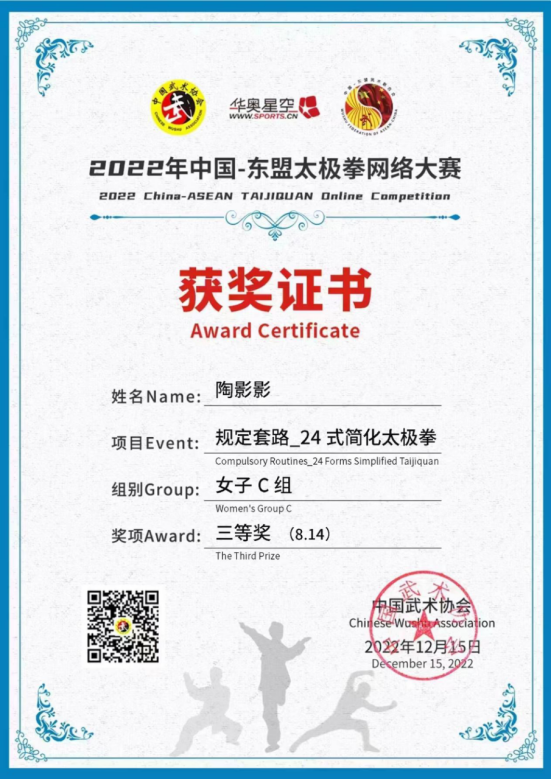 由中国武术协会主办,中国-东盟武术联合会合作举办的2022年中国-东盟太极拳网络大赛落下帷幕。beat365中文登录入口秦瑞瑞老师获得24式简化太极拳一等奖,陈式太极拳(56式)二等奖,人文教育学院学生冯玉鑫、陶影影获得24式简化太极拳三等奖。