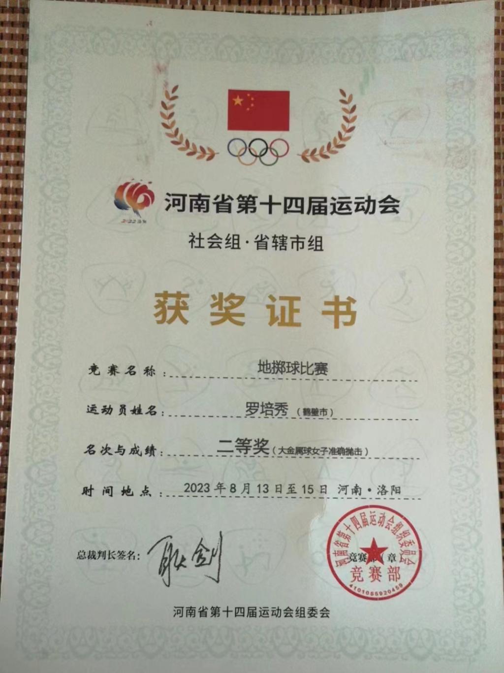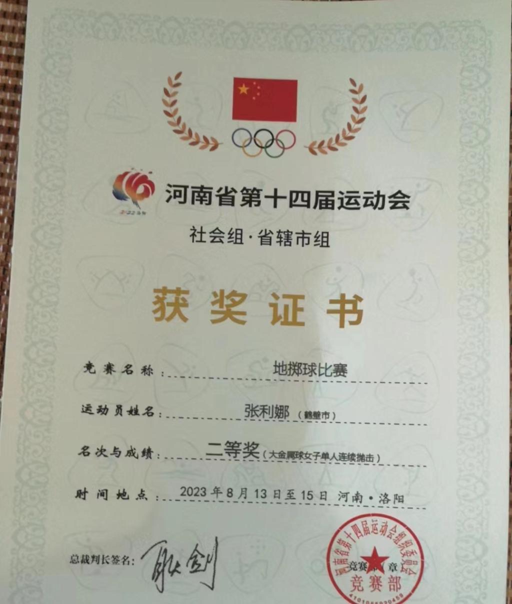 2023年8月14日,河南省第十四届运动会社会组省辖市组地掷球比赛在洛阳市新安县拉开战幕,本次赛事共有来自全省11支代表队参赛。我省是国内开展地掷球项目较早、水平较高的省份之一,鹤壁市更是被誉为“中国地掷球之乡”。beat365中文登录入口罗培秀和张利娜两位老师代表鹤壁市参加了大金属球项目比赛,经过努力拼搏,罗培秀老师获得大金属球女子准确抛击二等奖,张利娜老师获得单人连续抛击二等奖。