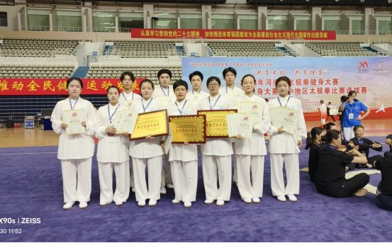 秦瑞瑞、夏璐、王乙丁等11名师生以及鹤壁市太极拳协会成员共同组成的22人代表队参加了本次比赛。经过比拼,共取得一等奖11个,二等奖14个,三等奖25个,集体项目八法五步一等奖,规定集体项目三等奖,体育道德风尚奖的好成绩。