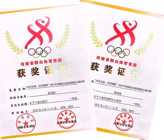 经过激烈比拼,秦瑞瑞获得个人项目传统陈式太极拳一等奖、太极刀一等奖,夏璐获得集体项目八法五步一等奖、个人项目传统陈式太极拳三等奖、太极刀三等奖。