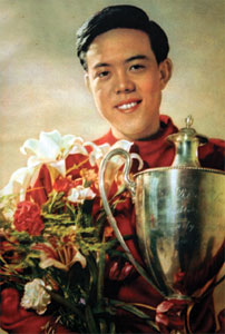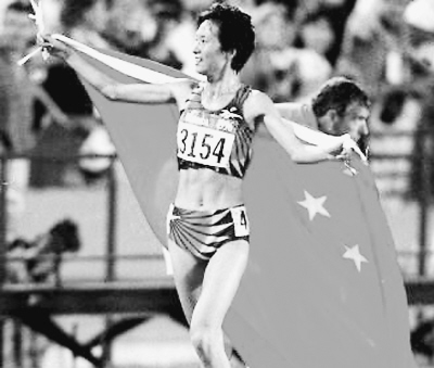 王军霞在1996年亚特兰大奥运会上夺取5000米金牌后,身披五星红旗向观众致意。