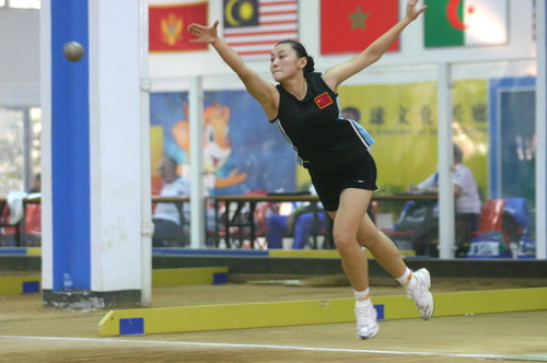 华奥星空讯10月22日上午,在温州举行的世界女子金属地掷球锦标赛双人连续抛击比赛中,中国运动员王美、郭晓敏以41:40的比分击败法国队,继昨天获得女子单人赛金牌后,为中国再获一枚金牌。图为:王美、郭晓敏在比赛中的场面。